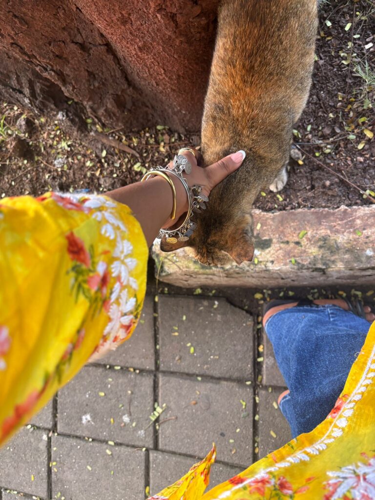 The cat lifts her head, eyes gleaming with recognition, and stretches ever so slightly before pressing her head against the girl’s outstretched hand. The world slows down in that moment. No cars honking in the distance, no hurried footsteps rushing by. Just the girl, the cat.